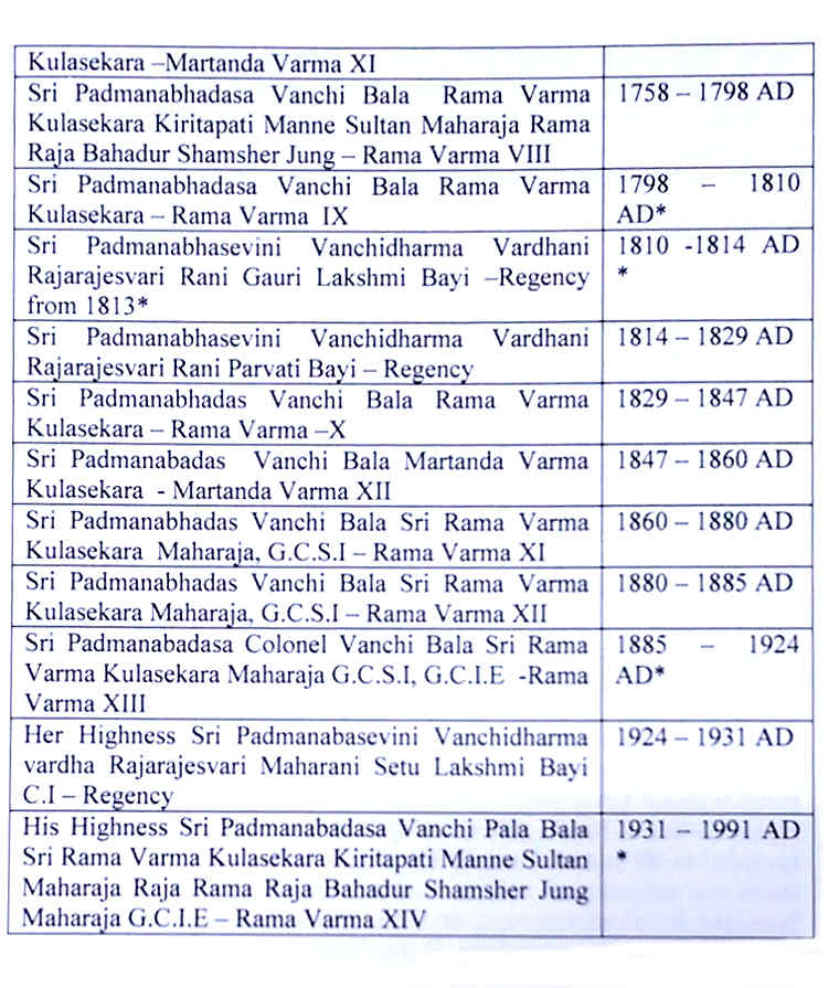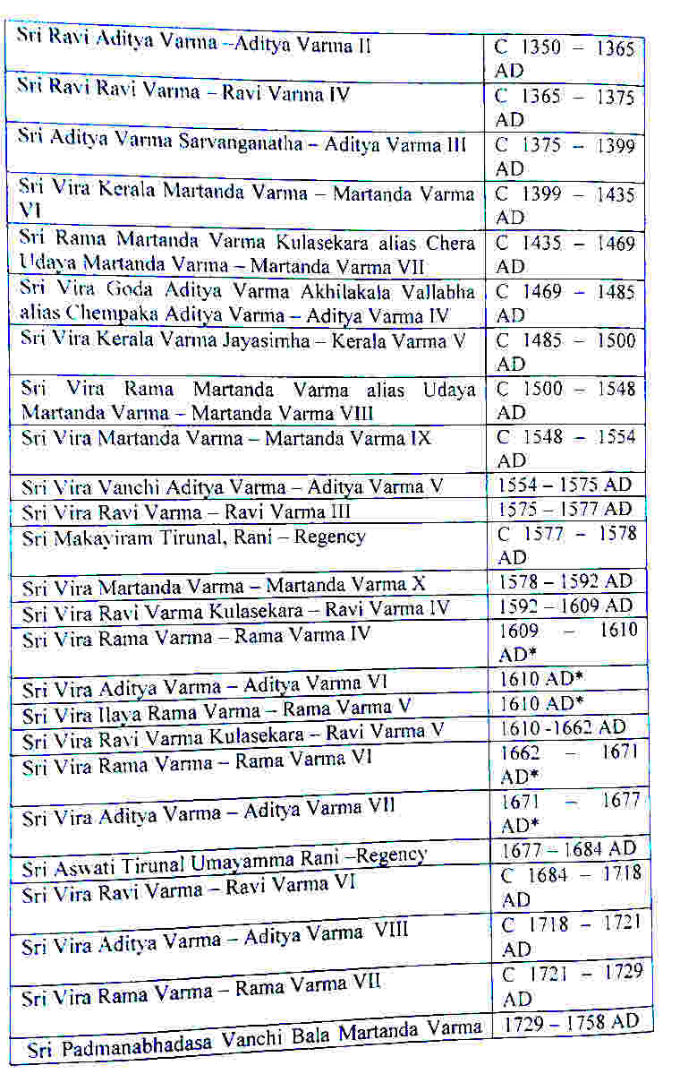 An analysis of the list confirms that there is an amalgamation of dynasties/families, like Aten, Aye, Uthayen, Porraiyan, Yadava, Villava, Vanava, Kothai, Perumal , Kulasekara, Ayyanadigal, Goda Varman, etc, and the ‘birth-star oriented kings (like Moolam Tirunal, Chitirai Tirunal, etc,) are seen only in a very later stage, with Brahmanic influence. For coronation, they used the traditional decorated palm-leaf crown, except in the last eras of 19 th or 20th century. The selection or nomination for King was done, probably in a way of rotation, the “Mootha” being nominated for the post of senior position of overall emperor, like ‘Perumal’. There was Ettu Turam Nadakkal in charge of the affairs. From around 1661 AD, there seems to have originated the section of Ettu Viittil Pillamar who had turned out to be the royal rebels or traitors in the long run.